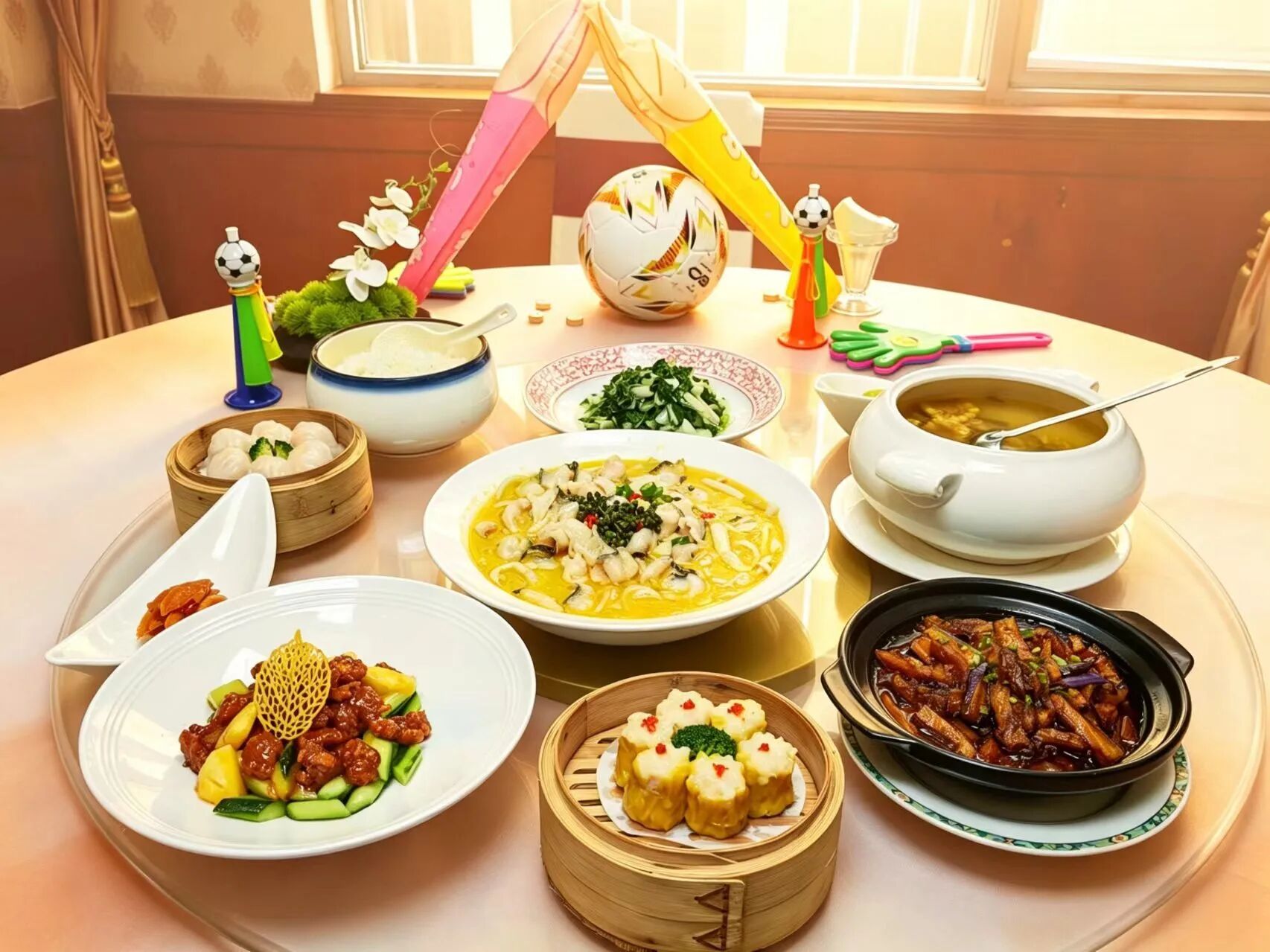 梅开二度泡芭乐 + 老将防线路萝卜皮 + 边路爆趟藤椒鱼 + 门前混战咕噜肉 + 虚晃假动作茄子煲 + 九十分钟老火汤 + 六脉神剑蟹子烧麦 + 六星连珠华侨虾饺 + 清道夫白灼时蔬 + 冠军碗飘香米饭