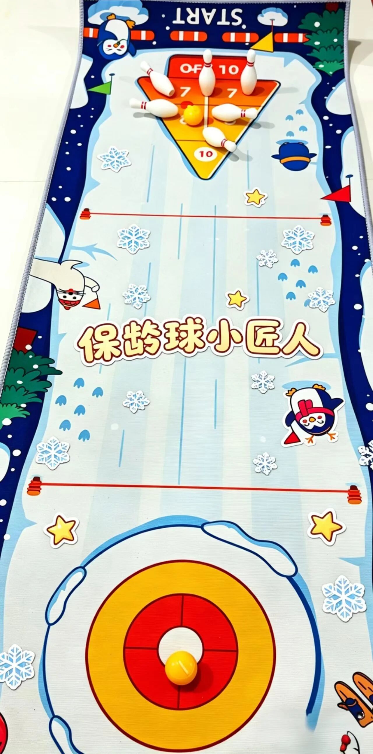保龄球小匠人:轮流推壶击倒球瓶,全年龄段欢乐畅玩。